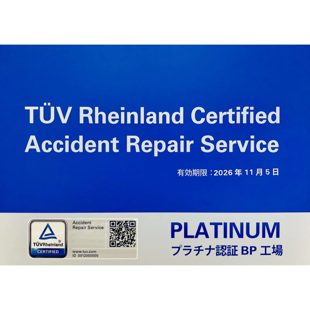 ドイツの第三者認証機関「TÜV(テュフ)」によるプラチナ認証を取得。 TÜVプラチナ認証は、鈑金・塗装分野で世界最高水準とされる品質の証。限られた工場だけが持つこの認証で、大切な一台を最高の技術で守ります。