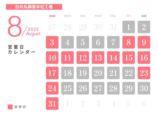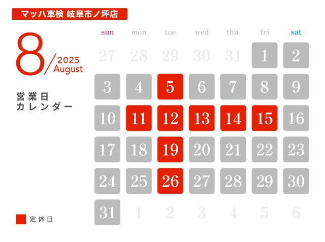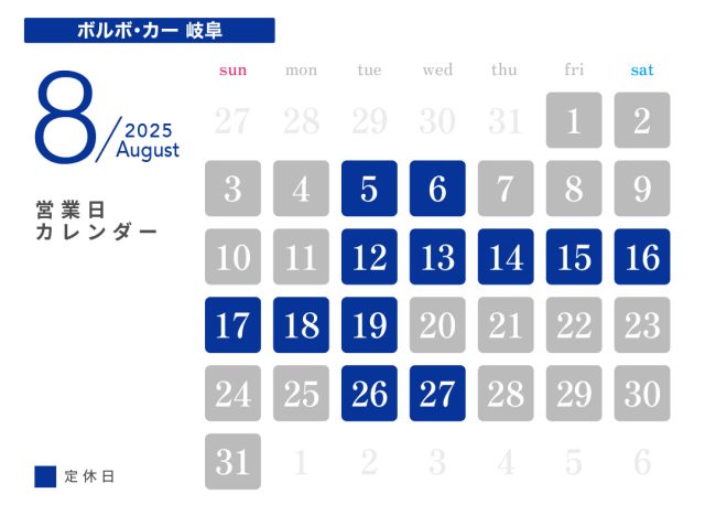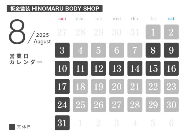 投稿日:2025.07.22 お知らせ 8月休業日のお知らせ ― 日の丸興業 本社工場 ― ― HINOMARU BODY SHOP ― ― ボルボ・カー岐阜 ― ― 軽楽市ひのまる ― ― マッハ車検 岐阜市ノ坪店 ―