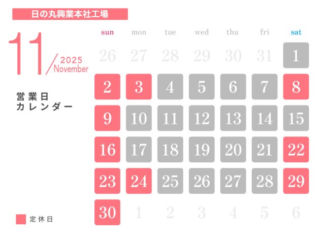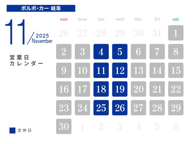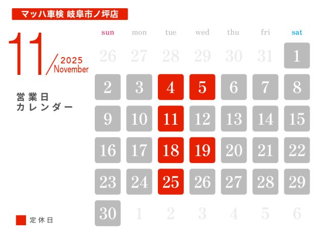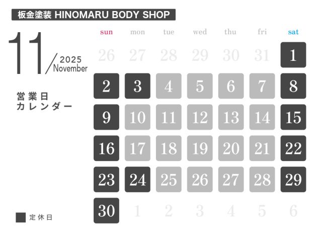 投稿日:2025.10.23 お知らせ 11月休業日のお知らせ ― 日の丸興業 本社工場 ― ― HINOMARU BODY SHOP ― ― ボルボ・カー岐阜 ― ― 軽楽市ひのまる ― ― マッハ車検 岐阜市ノ坪店 ―