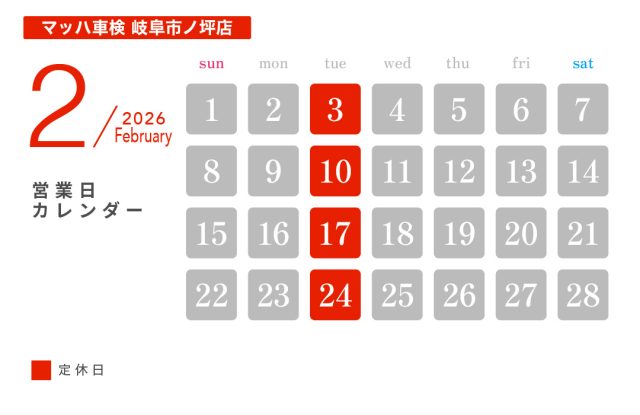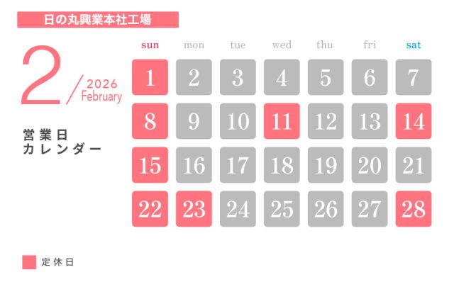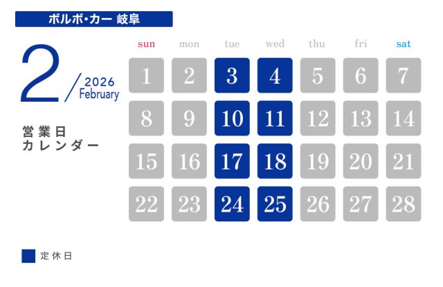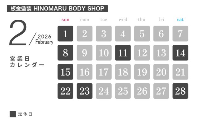 投稿日:2026.01.22 お知らせ 2月休業日のお知らせ ― 日の丸興業 本社工場 ― ― HINOMARU BODY SHOP ― ― ボルボ・カー岐阜 ― ― 軽楽市ひのまる ― ― マッハ車検 岐阜市ノ坪店 ―