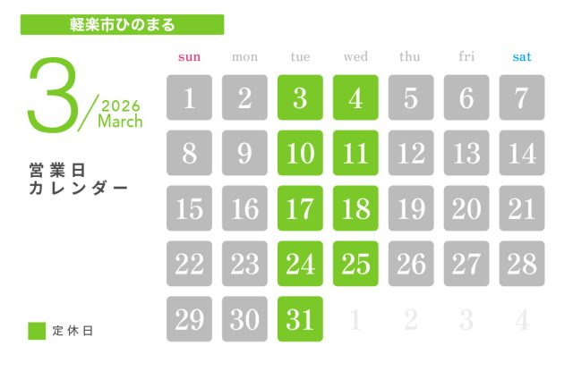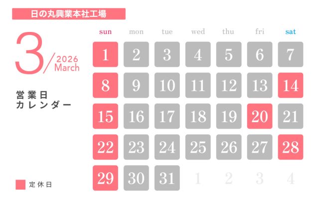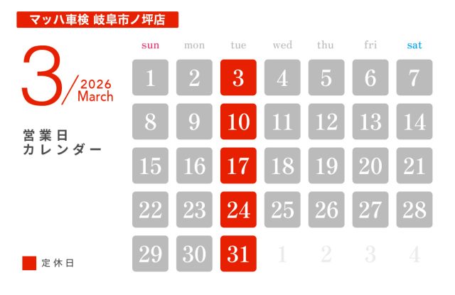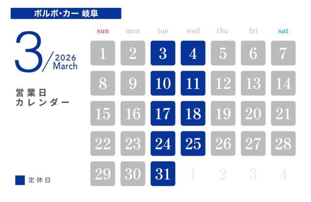 投稿日:2026.02.20 お知らせ 3月休業日のお知らせ ― 日の丸興業 本社工場 ― ― HINOMARU BODY SHOP ― ― ボルボ・カー岐阜 ― ― 軽楽市ひのまる ― ― マッハ車検 岐阜市ノ坪店 ―