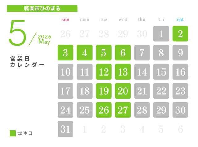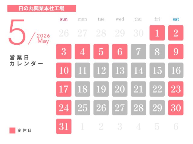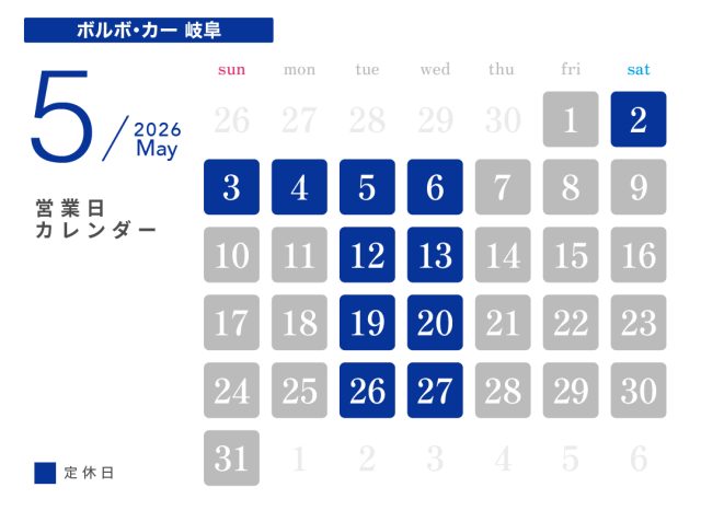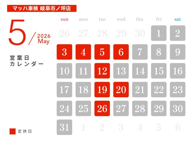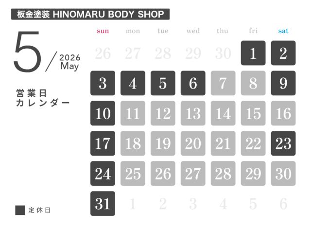 投稿日:2026.04.21 お知らせ 5月休業日のお知らせ ― 日の丸興業 本社工場 ― ― HINOMARU BODY SHOP ― ― ボルボ・カー岐阜 ― ― 軽楽市ひのまる ― ― マッハ車検 岐阜市ノ坪店 ―